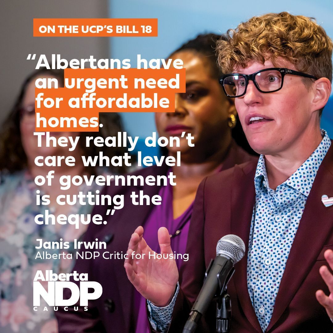 Janis Irwin, Critic for Housing is standing up for Albertans, alongside her colleagues in other critic areas, against the Provincial Priorities Act which would require provincial entities to obtain prior approval from Alberta's government before entering into, amending, extending or renewing an agreement with the federal government. This could significantly slow down, if not completely stop, large amounts of funding announced in the federal budget to address Canada’s housing crisis, dollars that could go a long way for low income Albertans, Albertans struggling to find affordable rentals, and those looking to purchase their first home.