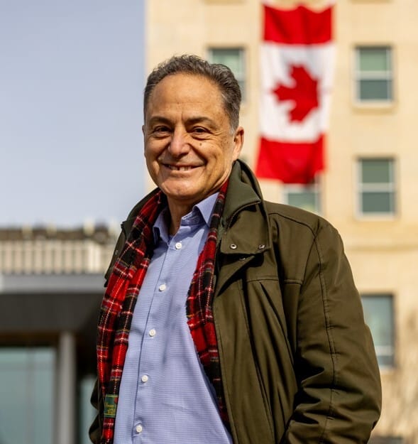 Joe in front of the Canada flag that hangs out the NDP Caucus office at the QEII building